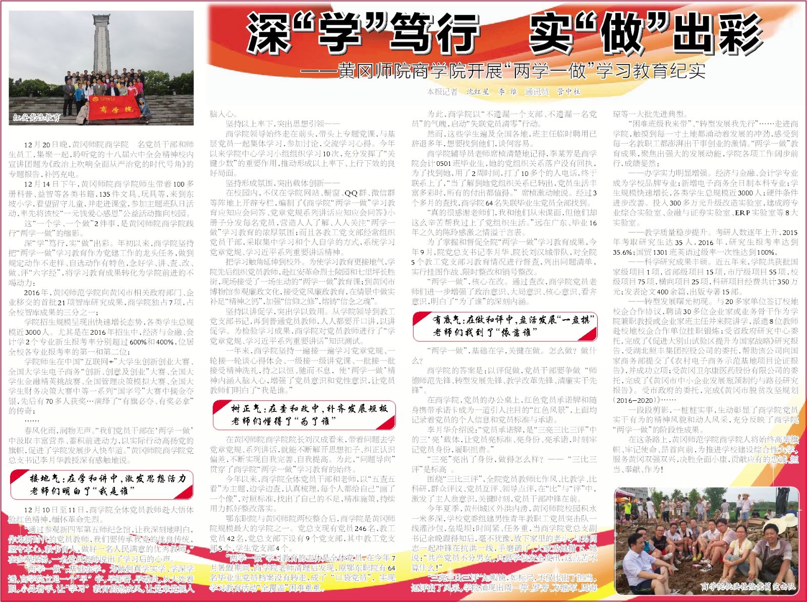 本网讯(通讯员 管中柱)12月29日,《黄冈日报》专版报道了bat365商学院2016年开展“两学一做”学习教育纪实。报道图文并茂,从“接地气:在学和讲中,激发思想活力,老师们明白了‘我是谁’”、“树正气:在查和改中,补齐发展短板,老师们懂得了‘为了谁’”、“有底气:在做和评中,盘活发展“一盘棋”,老师们找到了‘依靠谁’”三个层面全面报道了商学院党员实干有为的精神风貌和动人风采,充分反映了商学院“两学一做”的阶段性成果,展示了商学院将始终高举旗帜、牢记使命、昂首向前,为推进学校建设特色鲜明的高水平综合性应用型大学,服务黄冈“双强双兴”,决胜全面小康,贡献应有的忠诚、担当、奉献、作为!