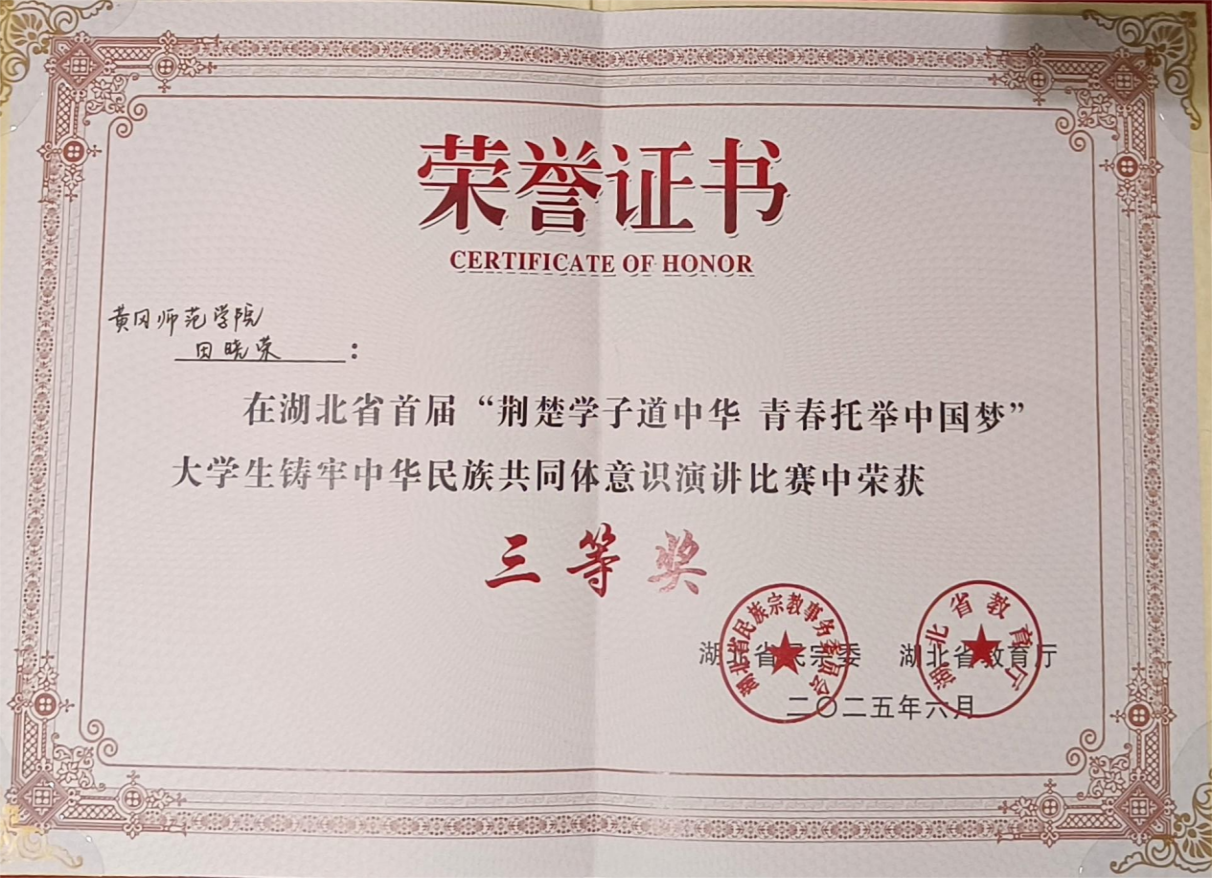 本网讯 6月16日,湖北省首届“荆楚学子道中华 青春托举中国梦”大学生铸牢中华民族共同体意识演讲比赛决赛在三峡大学圆满落幕。bat365教育学院田晓荣同学获三等奖。