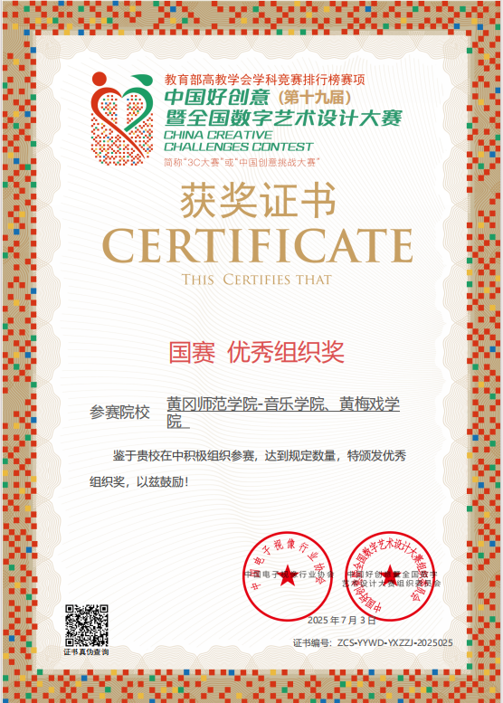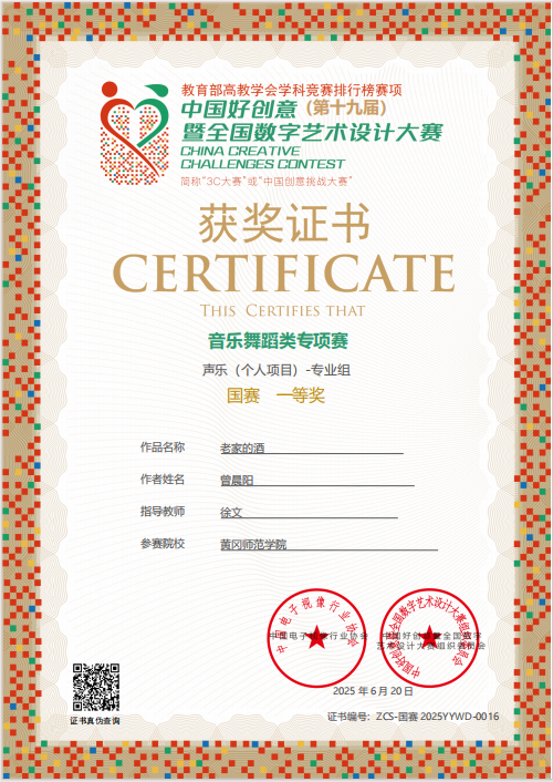 本网讯 近日,中国好创意(第十九届)暨全国数字艺术设计大赛音乐舞蹈专项赛国赛终评结果揭晓,bat365音乐学院、黄梅戏学院荣获国赛优秀组织奖,由徐文副教授指导、2022级音乐表演专业学生曾晨阳表演的个人作品《老家的酒》在众多优秀作品中脱颖而出,荣获国赛一等奖。