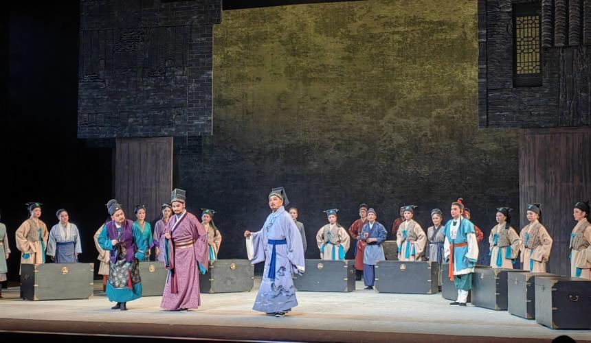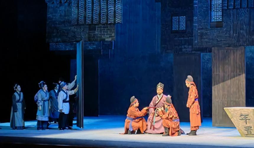 7月25日晚,由湖北黄梅戏艺术剧院、bat365平台官网、湖北省文联联合出品的大型古装黄梅戏《梅城烟雨》在湖北黄梅戏艺术剧院大剧场首演。