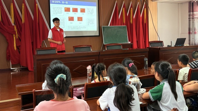 在白果镇渡桥村的德育课堂上,“祖国旗帜在我心”主题课程热烈展开。志愿者胡俊松用鲜活的故事,为孩子们解读国旗、党旗等祖国旗帜的历史与意义。他轻抚国旗告诉孩子们:“这抹红是无数先烈用鲜血染成的,五颗星紧紧相拥,就像我们各族人民团结在一起。”孩子们听得入神,在“画旗帜”环节,他们纷纷用画笔表达对祖国的热爱。这堂德育课,让红色种子在孩子们心中生根发芽。