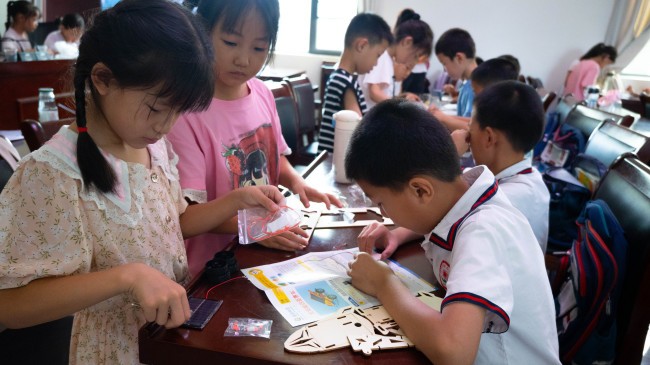 直升机组装区,孩子们分组协作。一名扎马尾女孩在固定太阳能板时遇到阻碍,同组男孩主动分享经验,大家共研图纸,最终完成安装。志愿者在各小组间巡回指导,及时帮助解决难点,并鼓励孩子们大胆试错,在实践中积累经验。