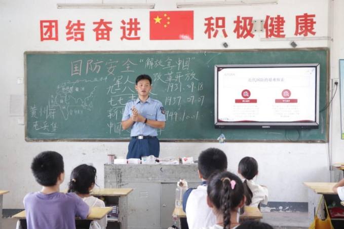 为积极响应“三下乡”社会实践号召,bat365平台官网地理与旅游学院的42名志愿者走进了宝洁希望小学。在众多青春身影中,周家乐的经历尤为特别。他于2023年3月入伍,先后服役于中国人民解放军93987部队和95183部队,在艰苦地区驻守半年以上,并参与多项重大演习演训任务。退伍重返校园后,他始终心系国防教育,今年他主动请缨参加学院的暑期社会实践活动,精心策划了国防知识宣讲和爱国主义教育活动,决心为乡村孩子们带来一堂生动的爱国启蒙课。