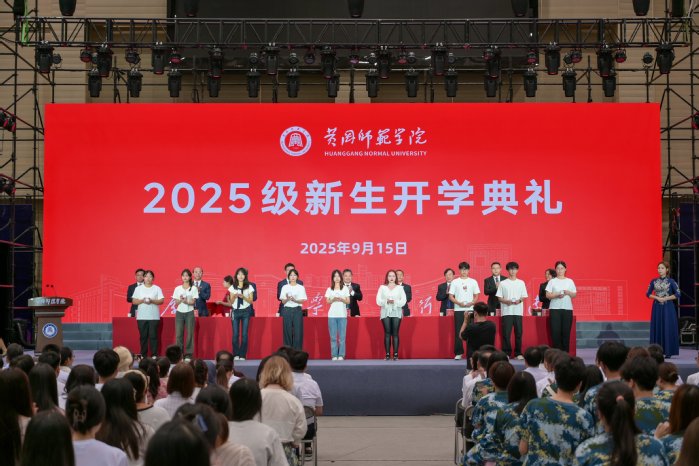 全体校领导为新生代表佩戴校徽,标志着2025级新生正式成为“黄师人”。