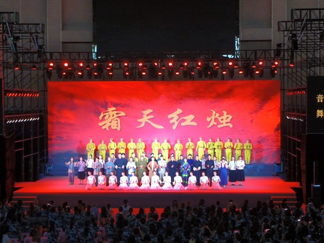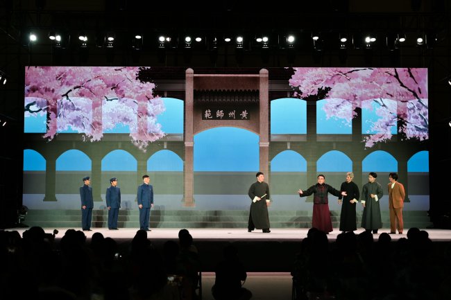 “学堂遍黄冈,处处读书声。百年老师范,代代铸师魂。初心似红烛,不畏霜天永放光明……”舞台上,伴随着歌声,演出帷幕拉开,身着长衫马褂和学生装的师生重现“黄州师范”学堂旧景。