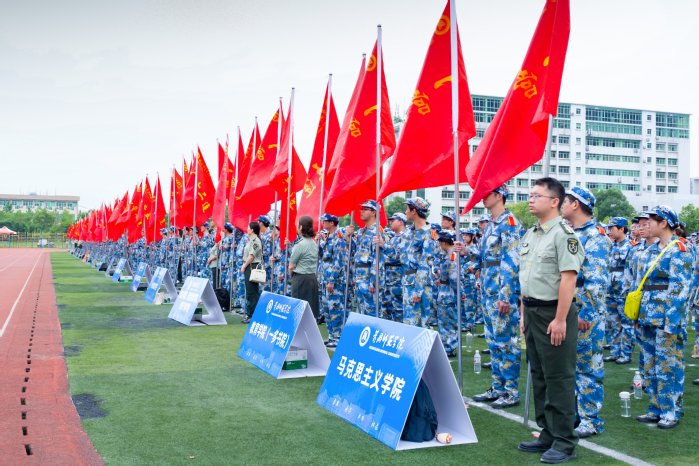 军训团相关负责人员以及全体承训教官,学校相关职能部门负责人、各教学学院党委书记、副书记、新生辅导员、班主任及全体新生参加军训动员大会。